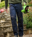 65% polyester/35% cotton. Water repellent finish.Part elasticated waistband with belt loops.Zip fly with button over.Two side patch pockets and two zip pockets with slanted entry.Rear pockets.Small coin pocket.Right leg zip pocket.Knee pad pockets.Reinforced crotch seam.Triple needle stitching.Cut out label.
