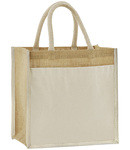 Unlaminated starched jute. Cotton carry handles (40cm long).Cotton canvas front pocket.Cut out label.Capacity 14 litres.